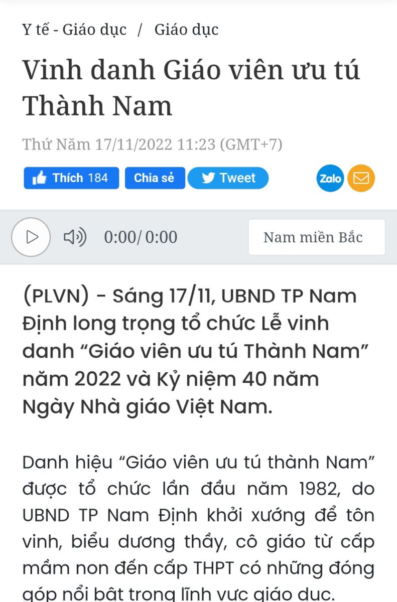 Bài viết ” VINH DANH GIÁO VIÊN ƯU TÚ THÀNH NAM” đăng trên báo pháp luật.