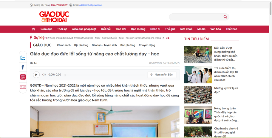 TRƯỜNG THCS NAM PHONG VINH DỰ ĐƯỢC LÊN BÁO GIÁO DỤC THỜI ĐẠI VÀ BÁO NAM ĐỊNH